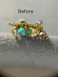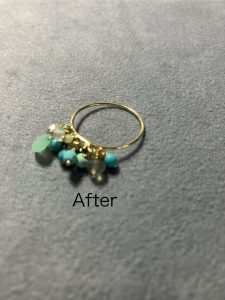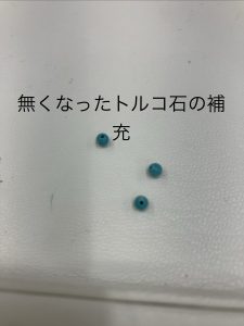 ターコイズの石が幾つか無くなってしまい,1番大きな石も外れてしまったので,ターコイズを補充して,外れた石も留めて欲しいとのご依頼でした。