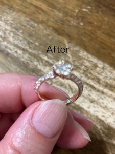 K18ピンクゴールドのダイヤモンドエンゲージリングサイズ直し#5.5→7でした。脇石は彫留でダイヤモンドが留まっているリングです。