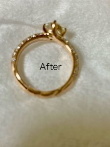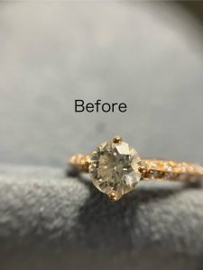 K18ピンクゴールドのダイヤモンドエンゲージリングサイズ直し#5.5→7でした。脇石は彫留でダイヤモンドが留まっているリングです。