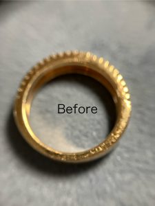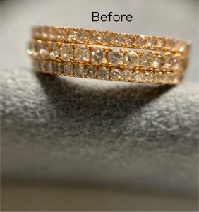 最初お預かりした時には,ピンクゴールドというイメージが余りなかったのですが,上がって来たら綺麗なピンクゴールドになっていて,お客様と一緒に綺麗になりましたねと喜びました。
