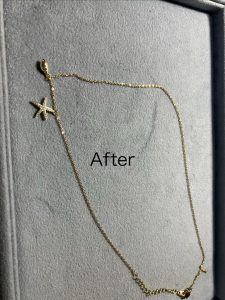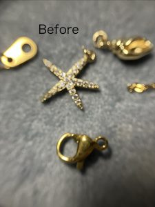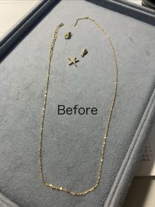 ブログ 地金不明ネックレス チェーン切れ修理 2026.02.16 こちらがもう一点の修理です。 地金の金性がわからないネックレスが切れて,チャームも外れてしまっていました。 出来る事としては,K18の丸カンを使って繋げる事でした。 ネックレスに火を当てずに18金の丸かんのみに火を当てて繋げました。 思い入れがあるネックレスだとの事で,直る事を大変お喜びになりました。 Tweet Share Pocket Pin it