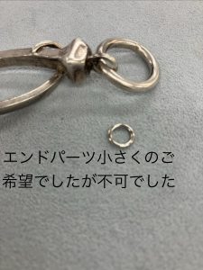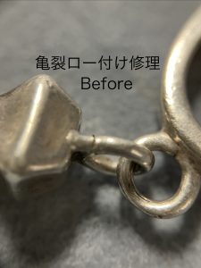 パーツの部分に亀裂が入ってて,このままだとその部分から切れてしまいそうなので修理をとお持ち下さいました。 その部分はロー付けをしました。 もう一つリクエストがあり,留め金を受ける丸カンが大きいので,留め金が入れば良いくらいのものになさりたいとの事でした。