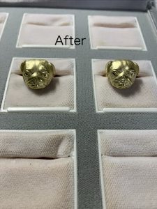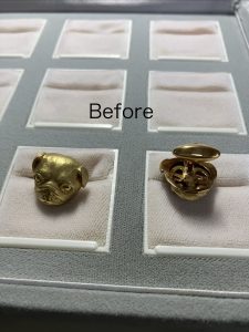 今回は,お父様のK18のパグ犬の顔のカフスをリングに作り替えのお仕事でした。